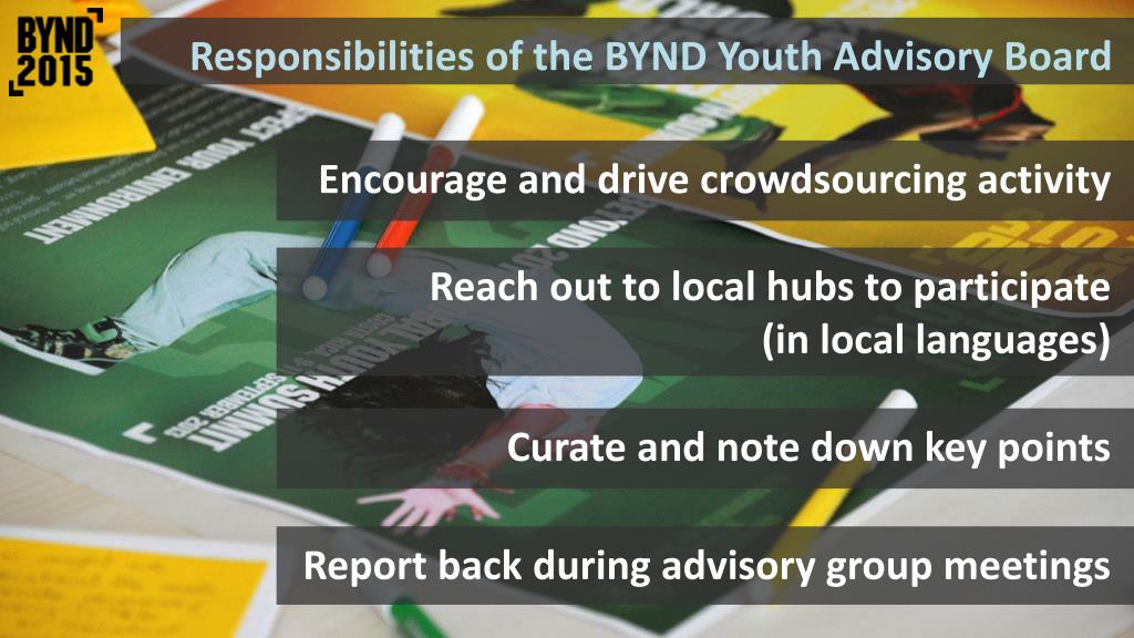 Responsibilities of the BYND Youth Advisory Board • Encourage and drive crowdsourcing activity • Reach out to local hubs to participate • (in local languages) • Curate and note down key points • Report back during advisory group meetings