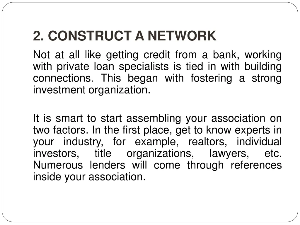 2. CONSTRUCT A NETWORK Not at all like getting credit from a bank, working with private loan specialists is tied in with building connections. This began with fostering a strong investment organization. It is smart to start assembling your association on two factors. In the first place, get to know experts in your industry, for example, realtors, individual investors, title organizations, lawyers, etc. Numerous lenders will come through references inside your association.