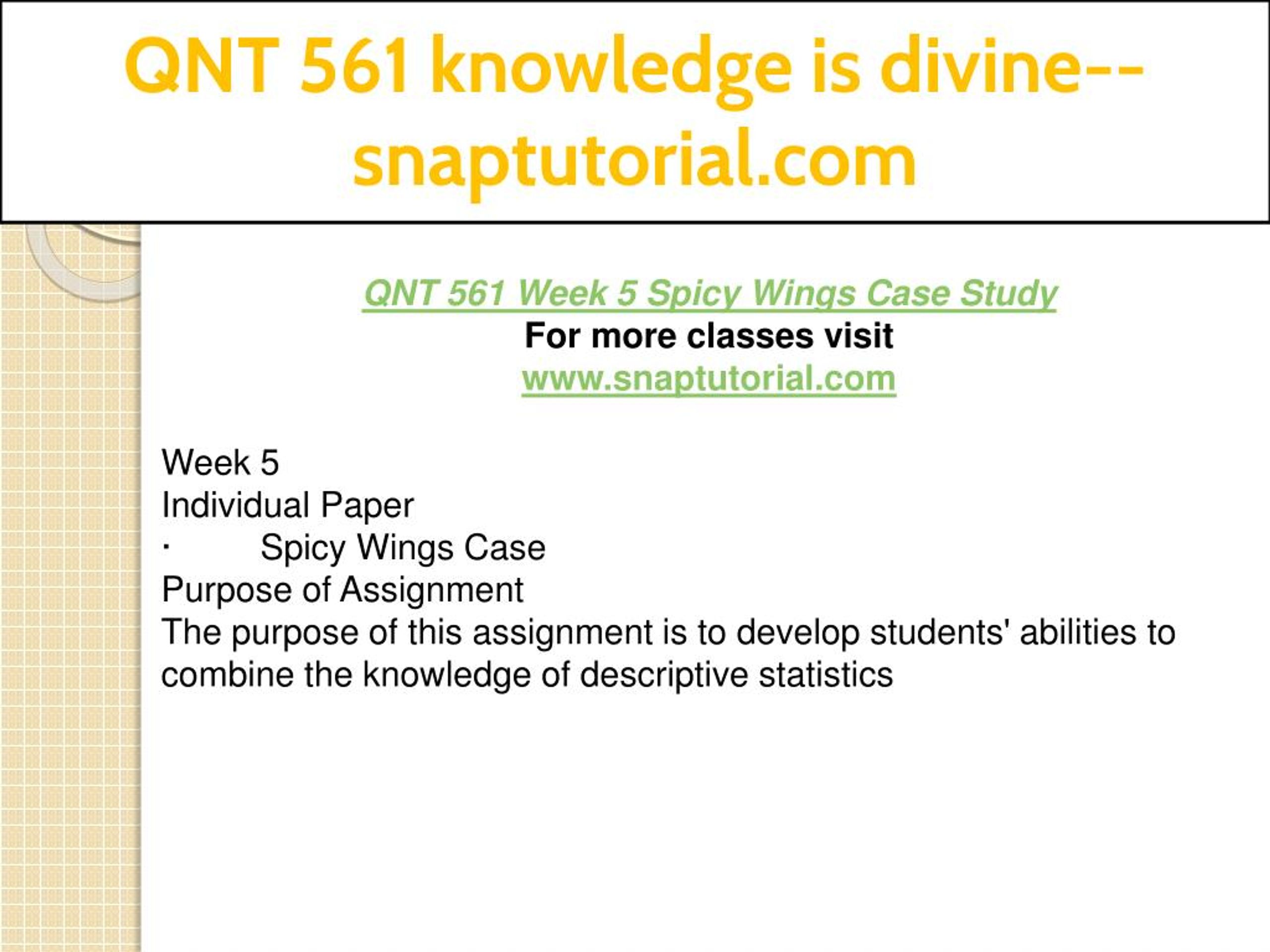 QNT 561 knowledge is divine--snaptutorial.com QNT 561 Week 5 Spicy Wings Case Study For more classes visit www.snaptutorial.com Week 5 Individual Paper · Spicy Wings Case Purpose of Assignment The purpose of this assignment is to develop students' abilities to combine the knowledge of descriptive statistics