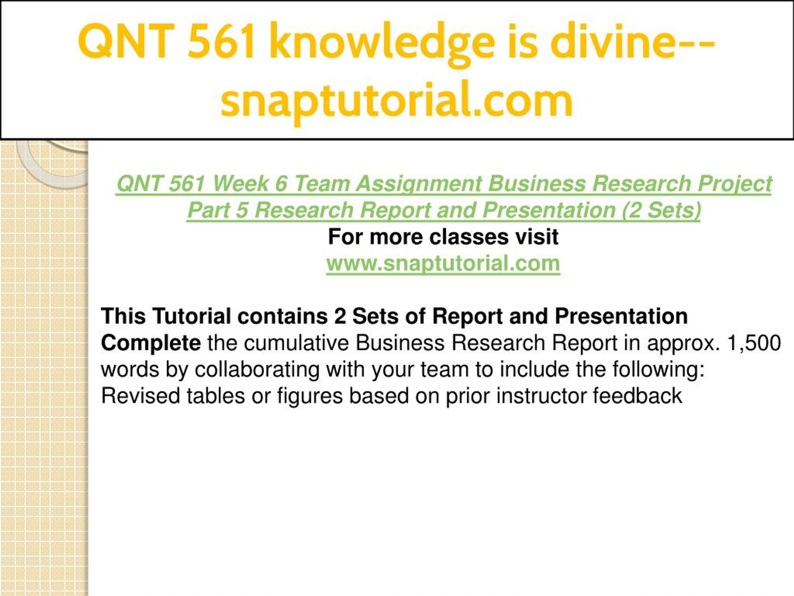 QNT 561 knowledge is divine--snaptutorial.com • QNT 561 Week 6 Team Assignment Business Research Project Part 5 Research Report and Presentation (2 Sets) • For more classes visit • www.snaptutorial.com • This Tutorial contains 2 Sets of Report and Presentation • Complete the cumulative Business Research Report in approx. 1,500 words by collaborating with your team to include the following: • Revised tables or figures based on prior instructor feedback