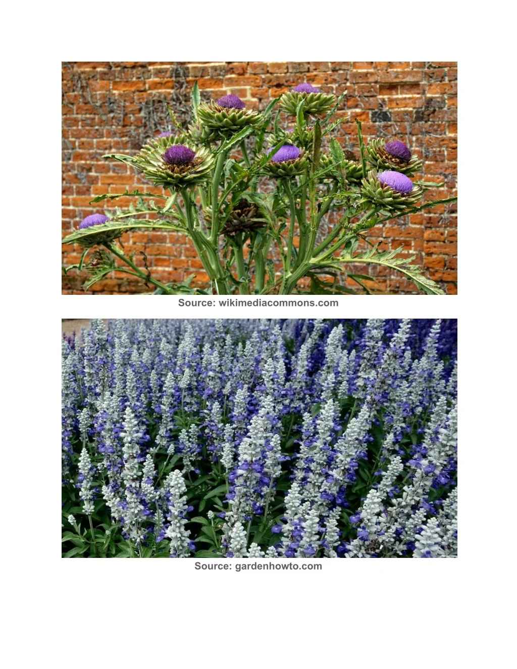 Artichoke plants reach up to heights of 3 to 6 feet with quite thick stems. They have leaves that are deeply lobed with prickly spines and you get a range from a green to a gray-green color. If you don’t harvest them, the buds will open into showy purple flowers which are most gorgeous and you don’t see them in everyday life. They are good-looking ornamental plants that also produce edible artichokes from fall until spring. In this particular type of climate, they are low-maintenance and only need light watering once they are grown well. You just have to grow these plants in well-draining soil and have to shelter them from strong winds. Salvia Source: gardeningknowhow.com