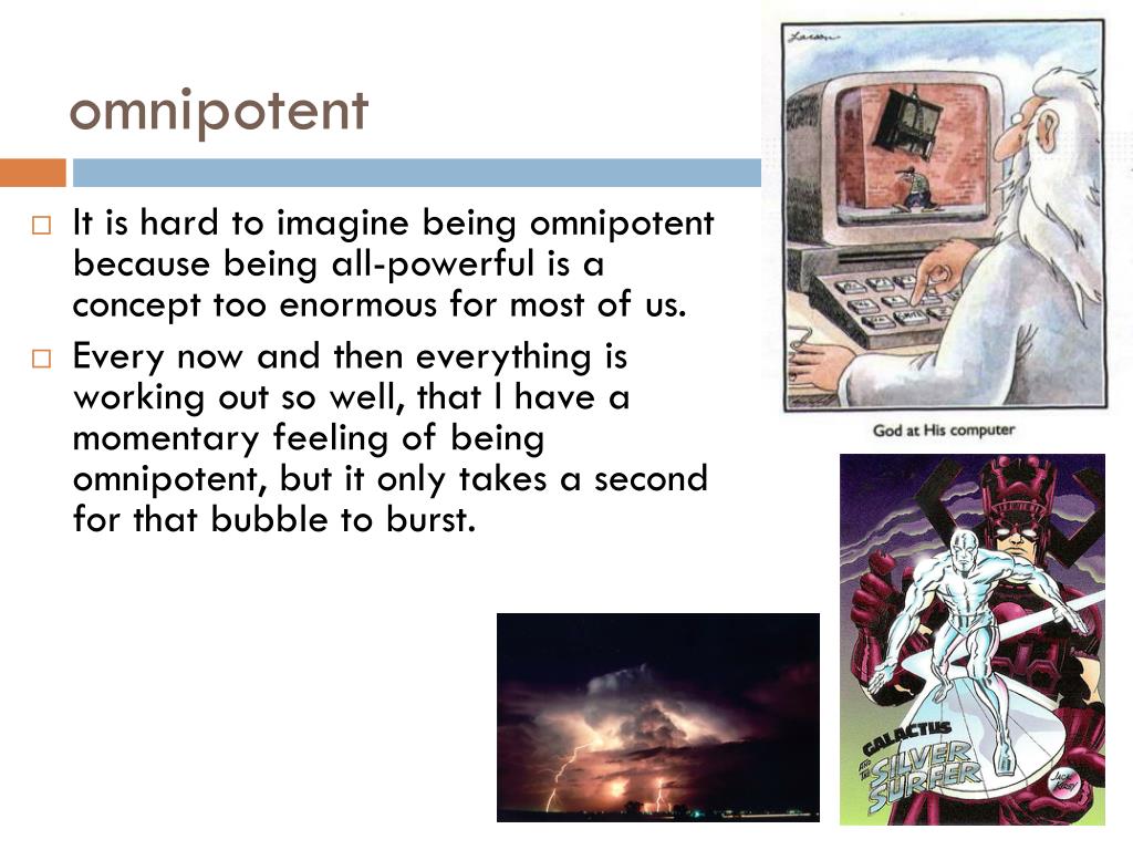omnipotent • It is hard to imagine being omnipotent because being all-powerful is a concept too enormous for most of us. • Every now and then everything is working out so well, that I have a momentary feeling of being omnipotent, but it only takes a second for that bubble to burst.