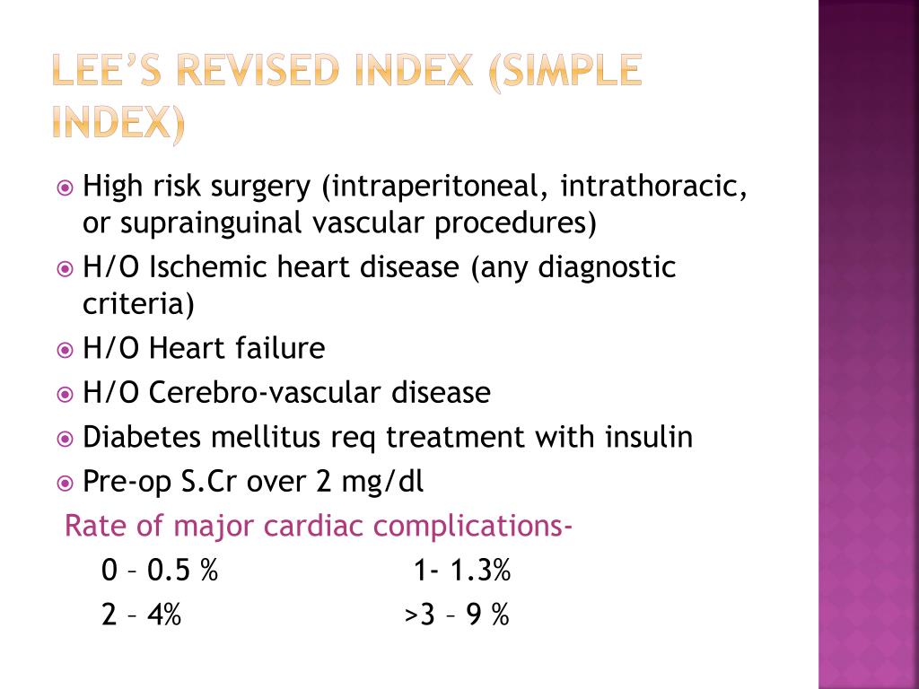 Lee’s revised index (simple index) • High risk surgery (intraperitoneal, intrathoracic, or suprainguinal vascular procedures) • H/O Ischemic heart disease (any diagnostic criteria) • H/O Heart failure • H/O Cerebro-vascular disease • Diabetes mellitus req treatment with insulin • Pre-op S.Crover 2 mg/dl Rate of major cardiac complications- 0 – 0.5 % 1- 1.3% 2 – 4% >3 – 9 %