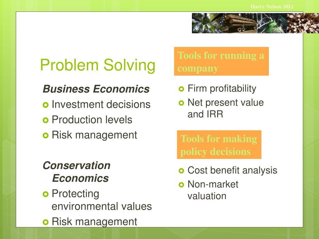 Problem Solving Tools for running acompany Business Economics • Investment decisions • Production levels • Risk management Conservation Economics • Protecting environmental values • Risk management • Firm profitability • Net present value and IRR • Cost benefit analysis • Non-market valuation Tools for makingpolicy decisions