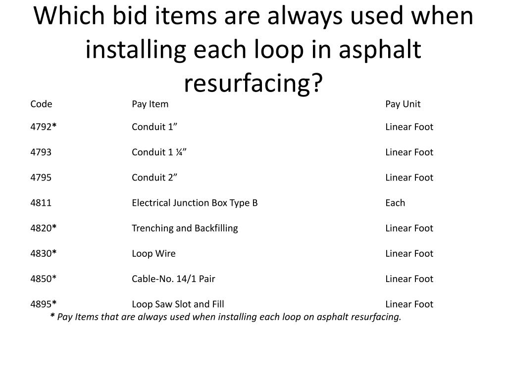 Which bid items are always used when installing each loop in asphalt resurfacing? Code Pay Item Pay Unit 4792* Conduit 1” Linear Foot 4793 Conduit 1 ¼” Linear Foot 4795 Conduit 2” Linear Foot 4811 Electrical Junction Box Type B Each 4820* Trenching and Backfilling Linear Foot 4830* Loop Wire Linear Foot 4850* Cable-No. 14/1 Pair Linear Foot 4895* Loop Saw Slot and Fill Linear Foot * Pay Items that are always used when installing each loop on asphalt resurfacing.