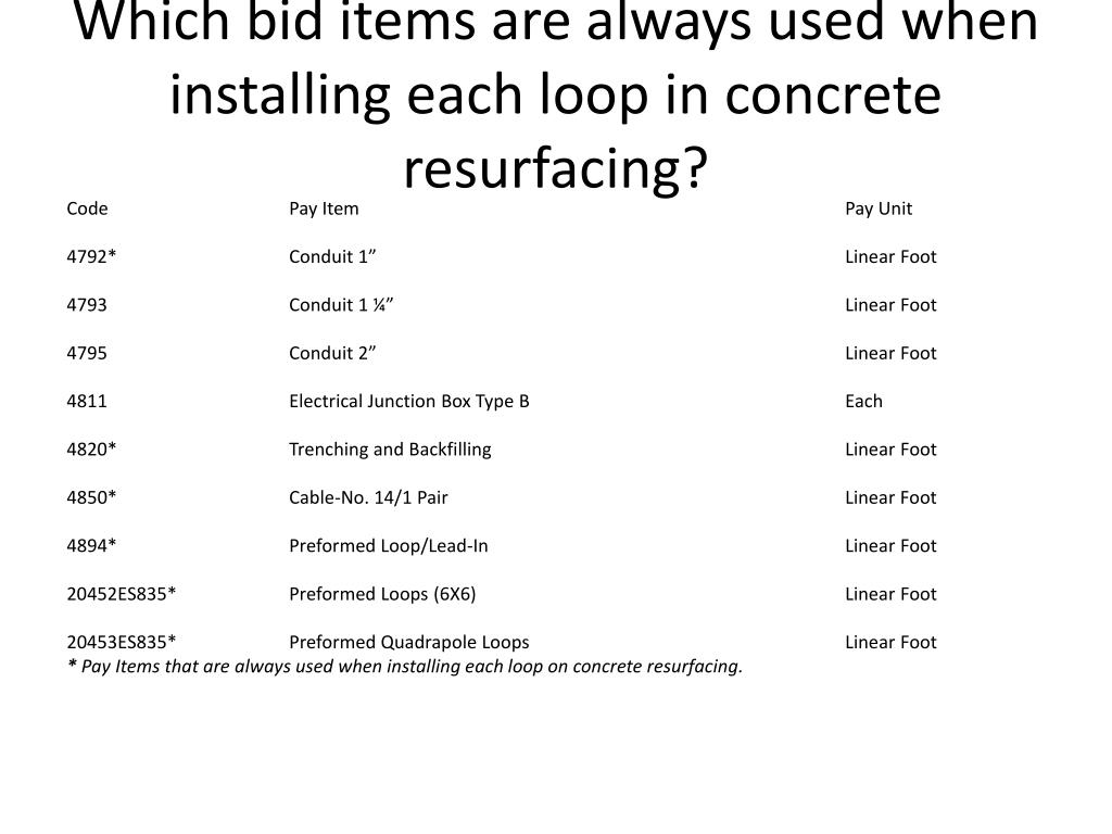 Which bid items are always used when installing each loop in concrete resurfacing? Code Pay Item Pay Unit 4792* Conduit 1” Linear Foot 4793 Conduit 1 ¼” Linear Foot 4795 Conduit 2” Linear Foot 4811 Electrical Junction Box Type B Each 4820* Trenching and Backfilling Linear Foot 4850* Cable-No. 14/1 Pair Linear Foot 4894* Preformed Loop/Lead-In Linear Foot 20452ES835* Preformed Loops (6X6) Linear Foot 20453ES835* Preformed Quadrapole Loops Linear Foot * Pay Items that are always used when installing each loop on concrete resurfacing.