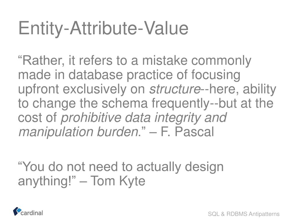 Entity-Attribute-Value “Rather, it refers to a mistake commonly made in database practice of focusing upfront exclusively on structure--here, ability to change the schema frequently--but at the cost of prohibitive data integrity and manipulation burden.” – F. Pascal “You do not need to actually design anything!” – Tom Kyte