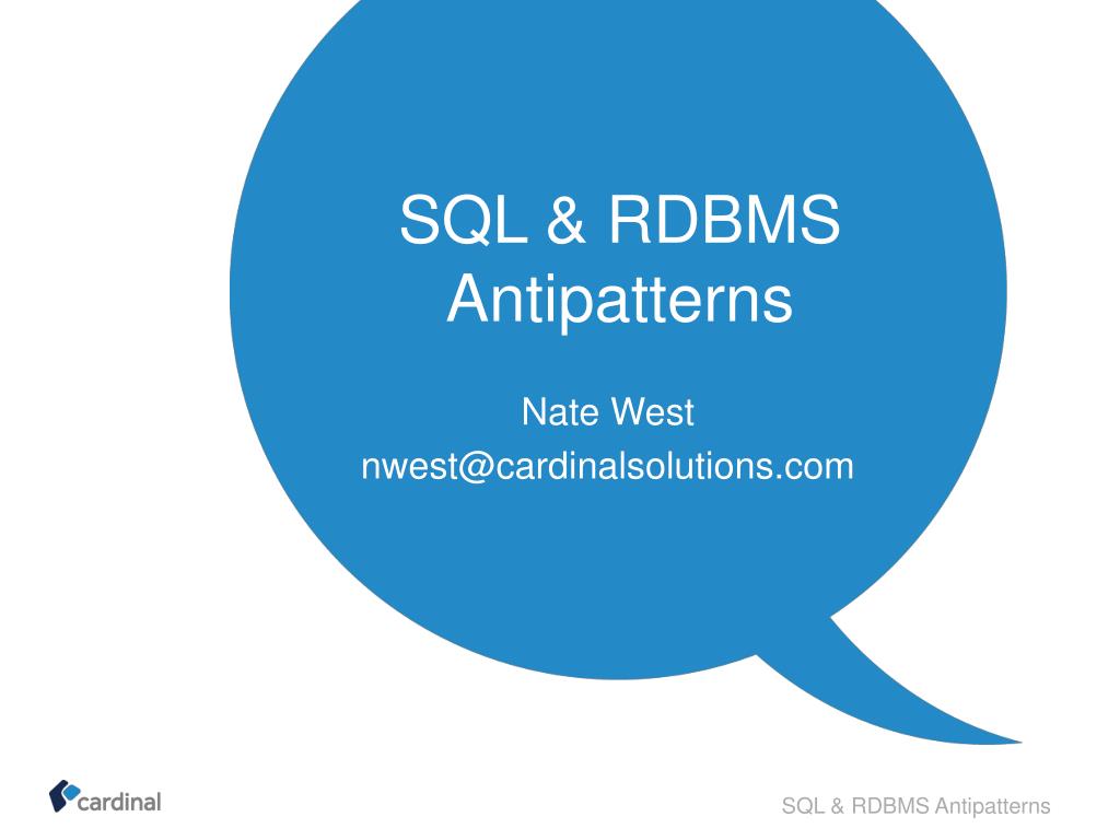 A special thanks to all our sponsors!. PLATINUM SPONSORS. GOLD SPONSORS. SILVER SPONSORS. SPONSORS. PRIZE & GIVEAWAY SPONSORS. SQL & RDBMS Antipatterns. Nate West nwest@cardinalsolutions.com.