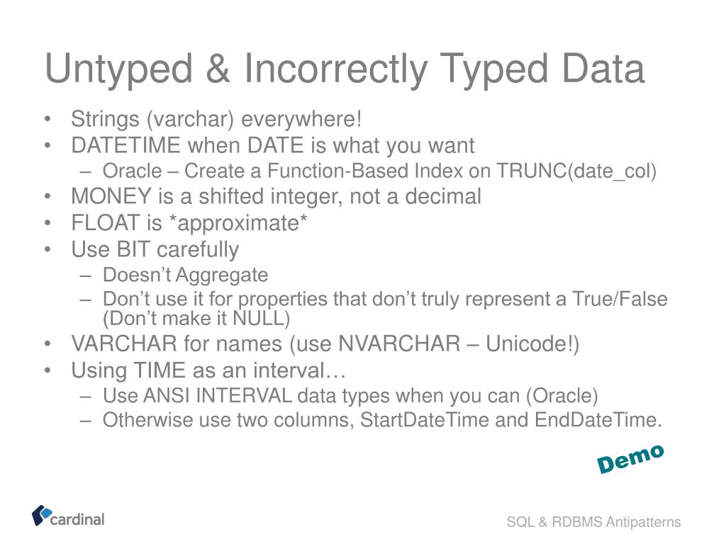 Untyped & Incorrectly Typed Data Demo • Strings (varchar) everywhere! • DATETIME when DATE is what you want • Oracle – Create a Function-Based Index on TRUNC(date_col) • MONEY is a shifted integer, not a decimal • FLOAT is *approximate* • Use BIT carefully • Doesn’t Aggregate • Don’t use it for properties that don’t truly represent a True/False (Don’t make it NULL) • VARCHAR for names (use NVARCHAR – Unicode!) • Using TIME as an interval… • Use ANSI INTERVAL data types when you can (Oracle) • Otherwise use two columns, StartDateTime and EndDateTime.