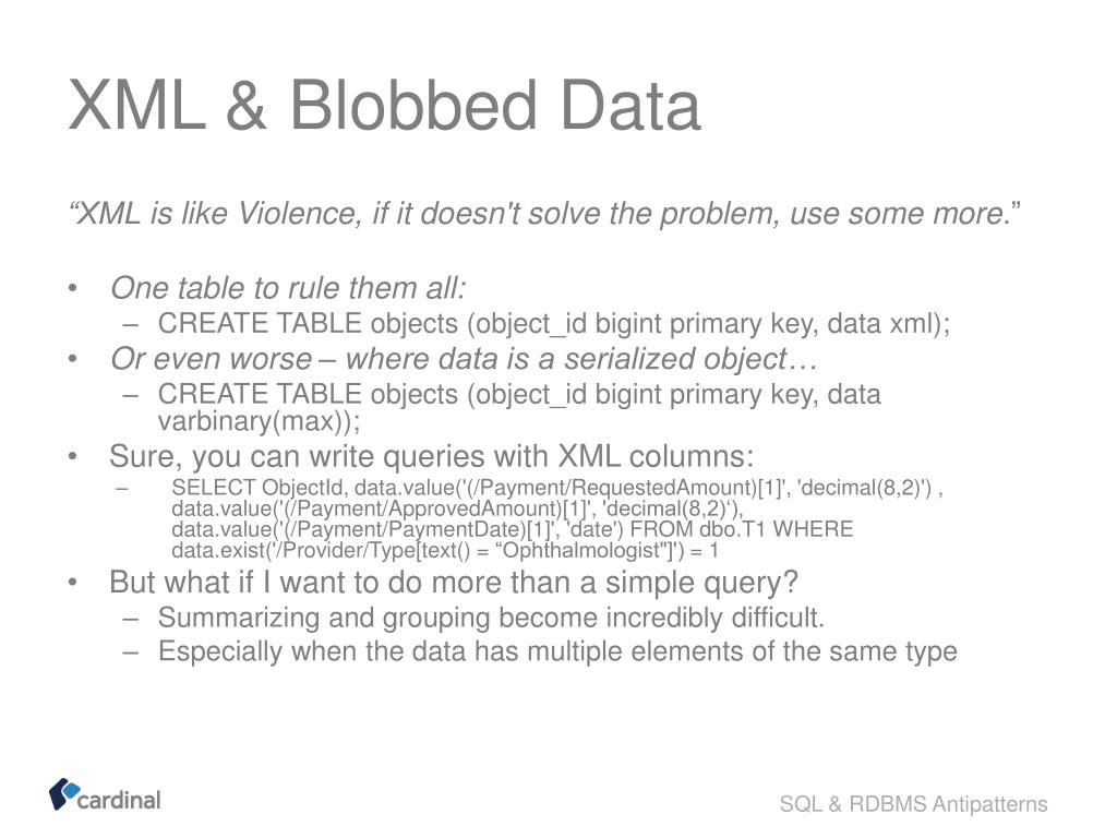 XML & Blobbed Data “XML is like Violence, if it doesn't solve the problem, use some more.” • One table to rule them all: • CREATE TABLE objects (object_idbigint primary key, data xml); • Or even worse – where data is a serialized object… • CREATE TABLE objects (object_idbigint primary key, data varbinary(max)); • Sure, you can write queries with XML columns: • SELECT ObjectId, data.value('(/Payment/RequestedAmount)[1]', 'decimal(8,2)') , data.value('(/Payment/ApprovedAmount)[1]', 'decimal(8,2)‘), data.value('(/Payment/PaymentDate)[1]', 'date') FROM dbo.T1 WHERE data.exist('/Provider/Type[text() = “Ophthalmologist"]') = 1 • But what if I want to do more than a simple query? • Summarizing and grouping become incredibly difficult. • Especially when the data has multiple elements of the same type