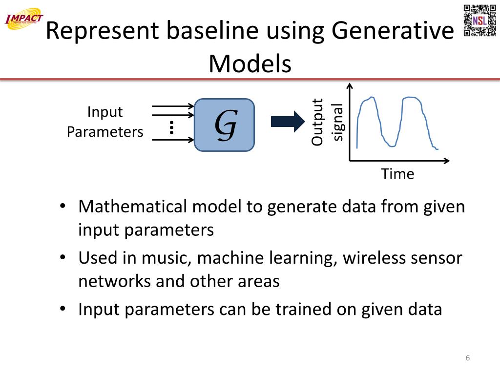 Represent baseline using Generative Models • Mathematical model to generate data from given input parameters • Used in music, machine learning, wireless sensor networks and other areas • Input parameters can be trained on given data … G Input Parameters Output signal Time