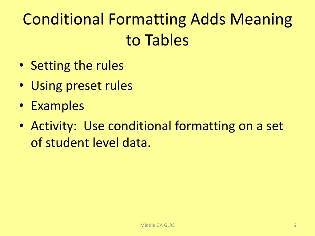 Conditional Formatting Adds Meaning to Tables • Setting the rules • Using preset rules • Examples • Activity: Use conditional formatting on a set of student level data. Middle GA GLRS