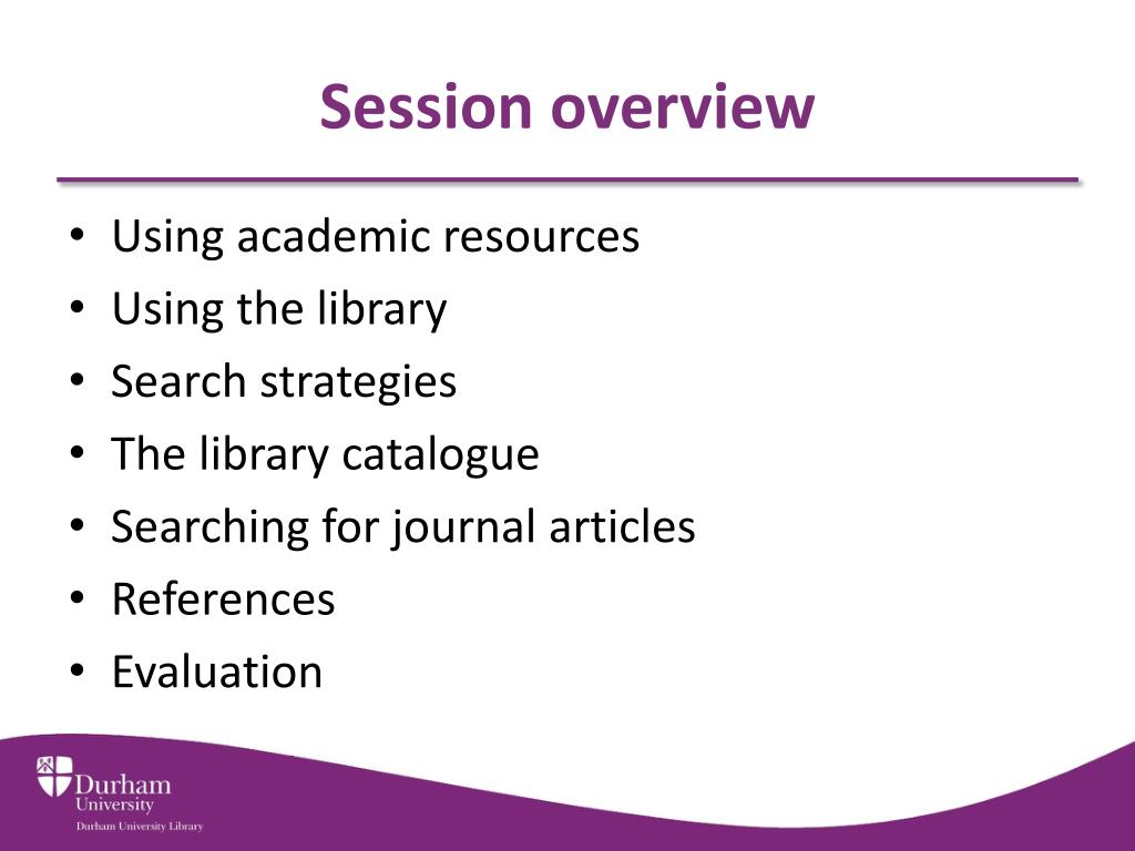 Session overview • Using academic resources • Using the library • Search strategies • The library catalogue • Searching for journal articles • References • Evaluation