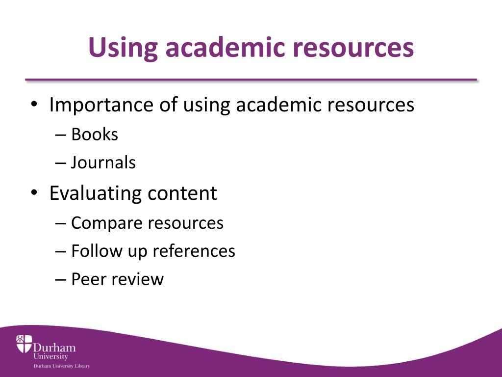 Using academic resources • Importance of using academic resources • Books • Journals • Evaluating content • Compare resources • Follow up references • Peer review