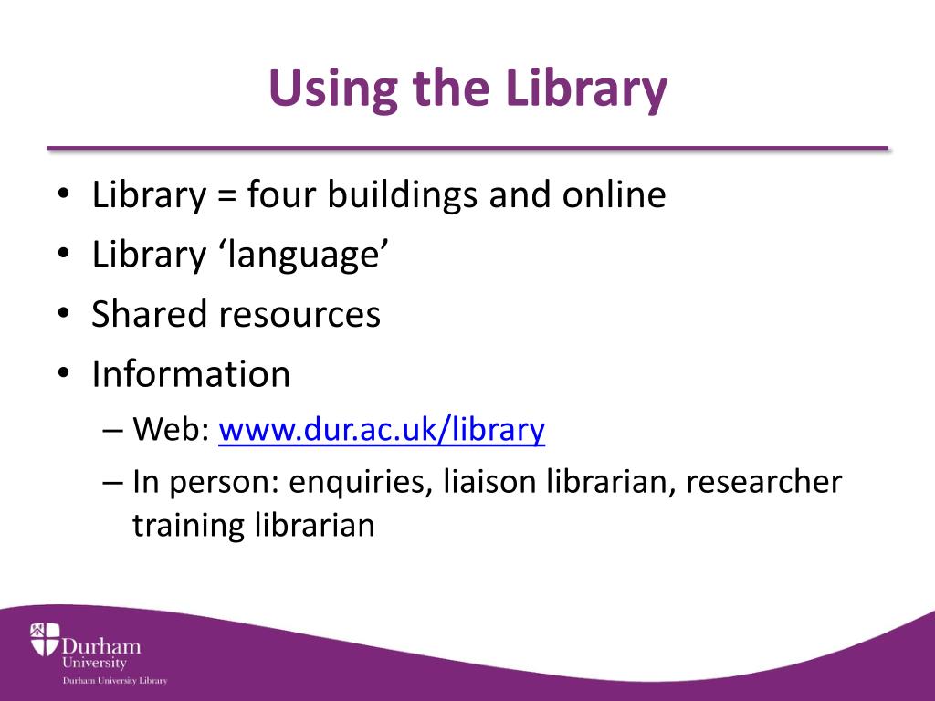 Using the Library • Library = four buildings and online • Library ‘language’ • Shared resources • Information • Web: www.dur.ac.uk/library • In person: enquiries, liaison librarian, researcher training librarian
