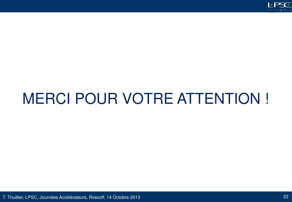 SOURCE DE 3EME GENERATION: PERFORMANCES Performance en uranium (test VENUS LBNL+MSU) • Spectre impressionant! • Four 2000°C avec un creuset en Rhenium • Consommation U ~9 mg/h • 2 kW 18 GHz+6.5 kW 28 GHz • VENUS réglée à fond • transmission LEBT limitée à 22 kV • drain HV 9 mA, CF tot~5mA • Pas de limitation du côté source, qui répond à la HF et à la température four U33+ O3+ O2+ U34+ U35+ Current (emA) M/Q • Emittance compatible avec les spécif. de FRIB Valide l’operation de FRIB avec 220 µA U33+ + 220 µA U34+ H V