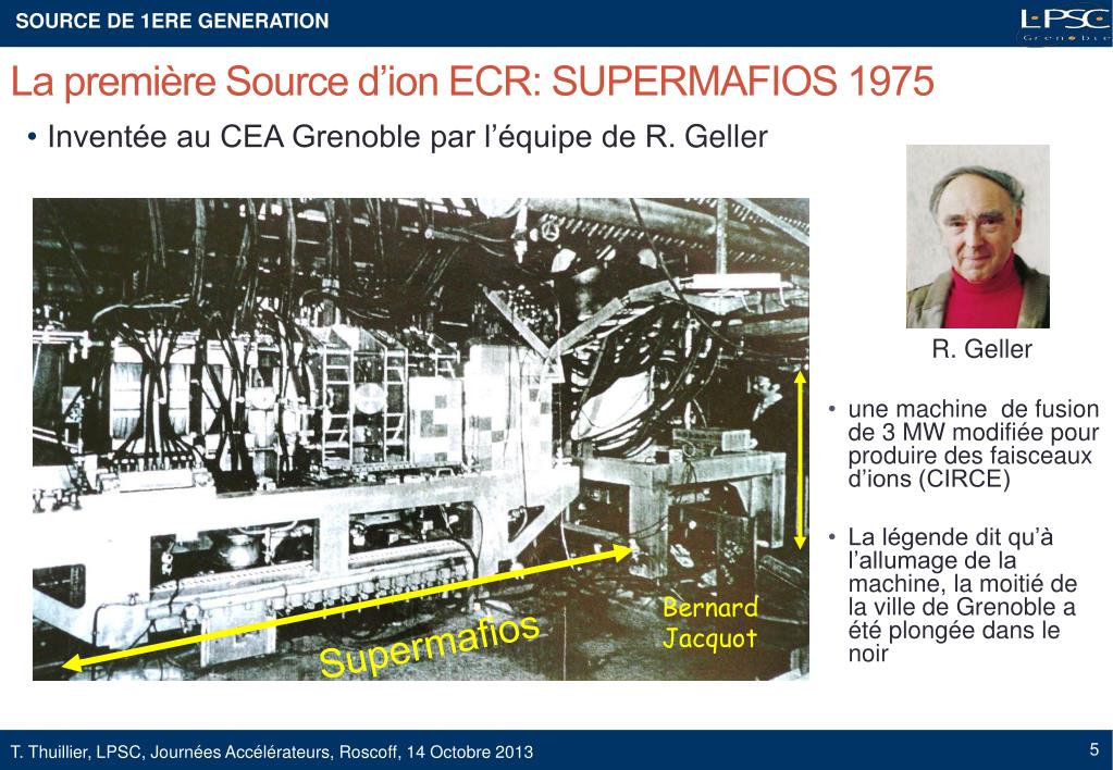 SOURCE DE 1ERE GENERATION La première Source d’ion ECR: SUPERMAFIOS 1975 • Inventée au CEA Grenoble par l’équipe de R. Geller R. Geller • une machine de fusion de 3 MW modifiée pour produire des faisceaux d’ions (CIRCE) • La légende dit qu’à l’allumage de la machine, la moitié de la ville de Grenoble a été plongée dans le noir Bernard Jacquot Supermafios T. Thuillier, LPSC, Journées Accélérateurs, Roscoff, 14 Octobre2013