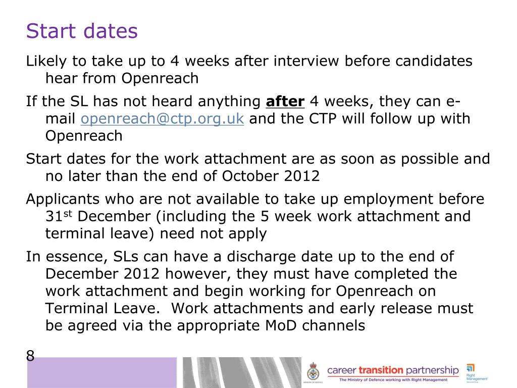 Start dates • Likely to take up to 4 weeks after interview before candidates hear from Openreach • If the SL has not heard anything after 4 weeks, they can e-mail openreach@ctp.org.uk and the CTP will follow up with Openreach • Start dates for the work attachment are as soon as possible and no later than the end of October 2012 • Applicants who are not available to take up employment before 31st December (including the 5 week work attachment and terminal leave) need not apply • In essence, SLs can have a discharge date up to the end of December 2012 however, they must have completed the work attachment and begin working for Openreach on Terminal Leave. Work attachments and early release must be agreed via the appropriate MoD channels • 8