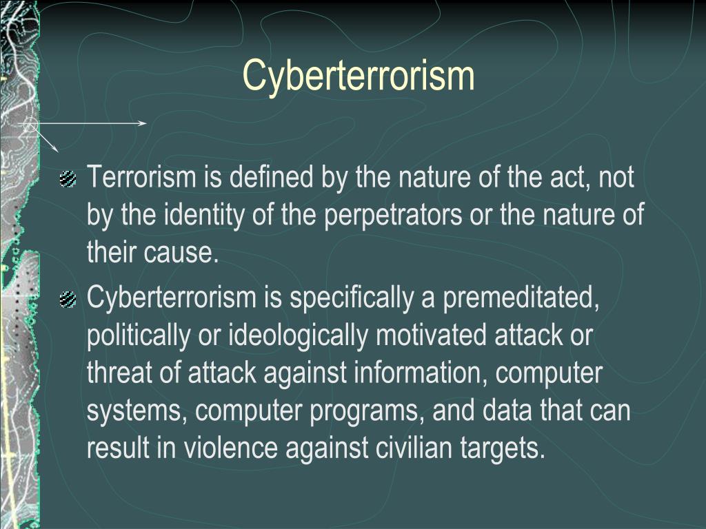 Cyberterrorism • Terrorism is defined by the nature of the act, not by the identity of the perpetrators or the nature of their cause. • Cyberterrorism is specifically a premeditated, politically or ideologically motivated attack or threat of attack against information, computer systems, computer programs, and data that can result in violence against civilian targets.