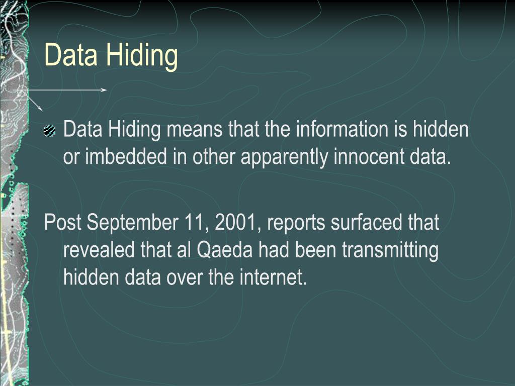 Data Hiding • Data Hiding means that the information is hidden or imbedded in other apparently innocent data. Post September 11, 2001, reports surfaced that revealed that al Qaeda had been transmitting hidden data over the internet.