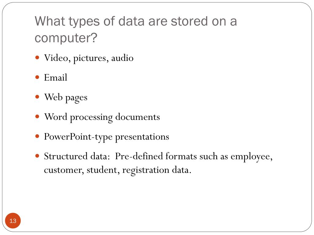 What types of data are stored on a computer? • Video, pictures, audio • Email • Web pages • Word processing documents • PowerPoint-type presentations • Structured data: Pre-defined formats such as employee, customer, student, registration data.