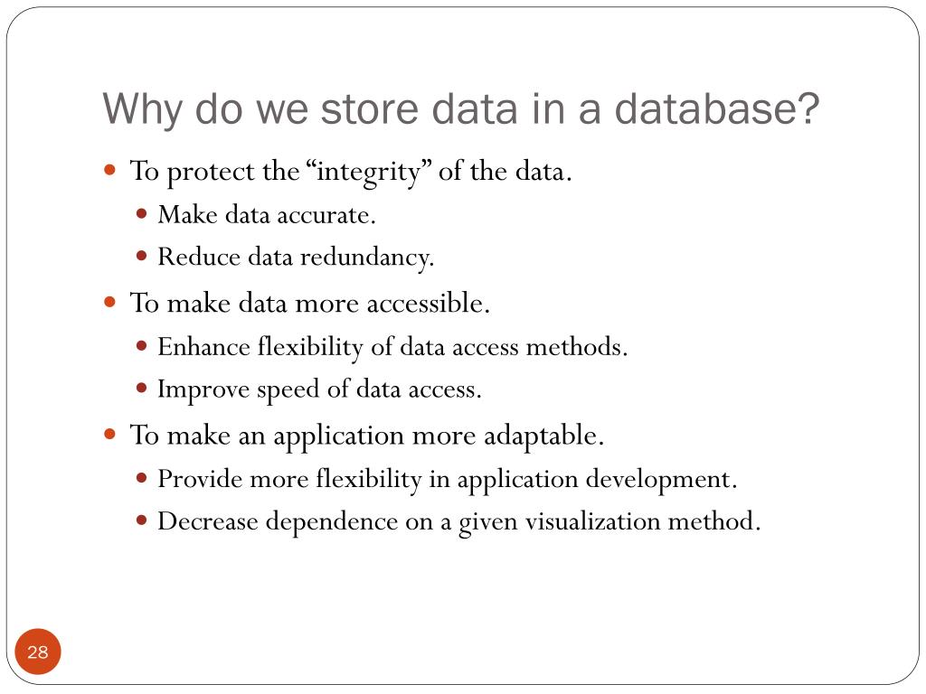 Why do we store data in a database? • To protect the “integrity” of the data. • Make data accurate. • Reduce data redundancy. • To make data more accessible. • Enhance flexibility of data access methods. • Improve speed of data access. • To make an application more adaptable. • Provide more flexibility in application development. • Decrease dependence on a given visualization method.
