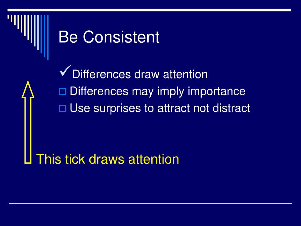 This tick draws attention Be Consistent • Differences draw attention • Differences may imply importance • Use surprises to attract not distract