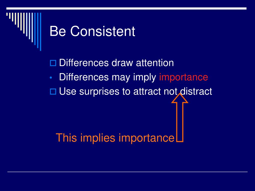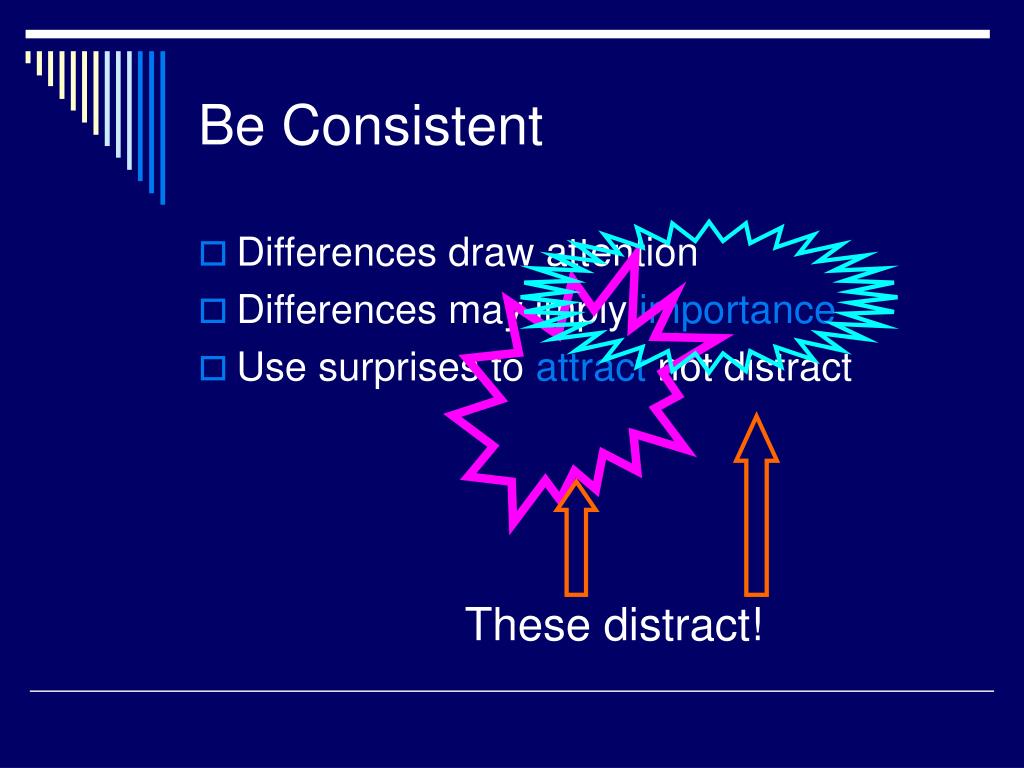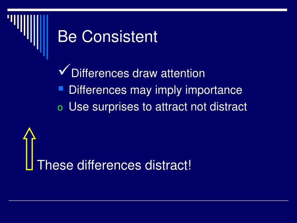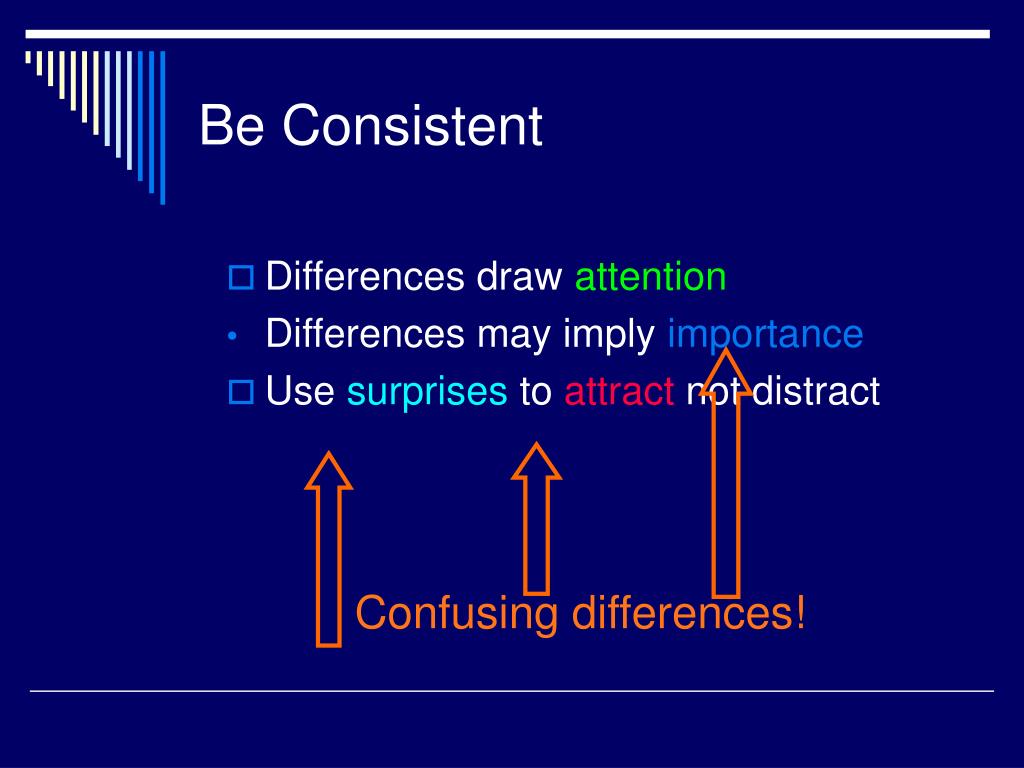 These distract! Be Consistent • Differences draw attention • Differences may imply importance • Use surprises to attract not distract