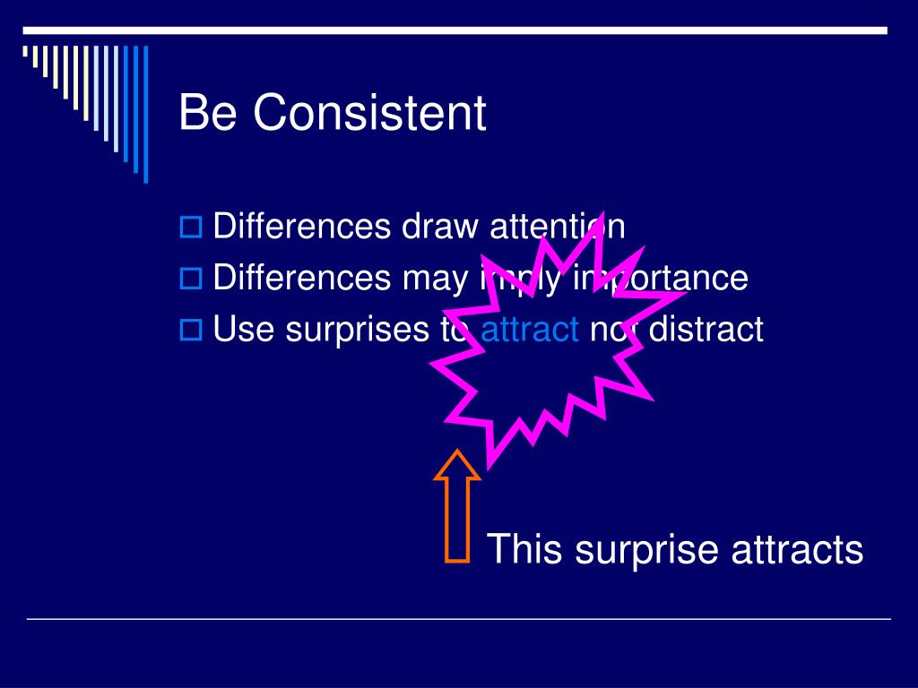 This surprise attracts Be Consistent • Differences draw attention • Differences may imply importance • Use surprises to attract not distract