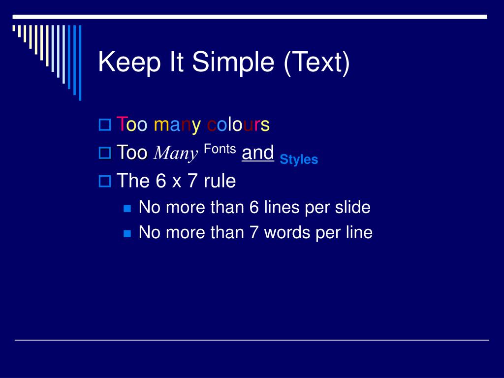 Keep It Simple (Text) • Too manycolours • TooManyFontsandStyles • The 6 x 7 rule • No more than 6 lines per slide • No more than 7 words per line