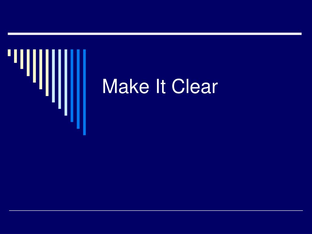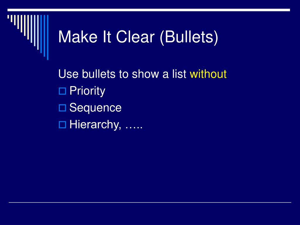 Make It Clear (Bullets) Use bullets to show a list without • Priority • Sequence • Hierarchy, …..