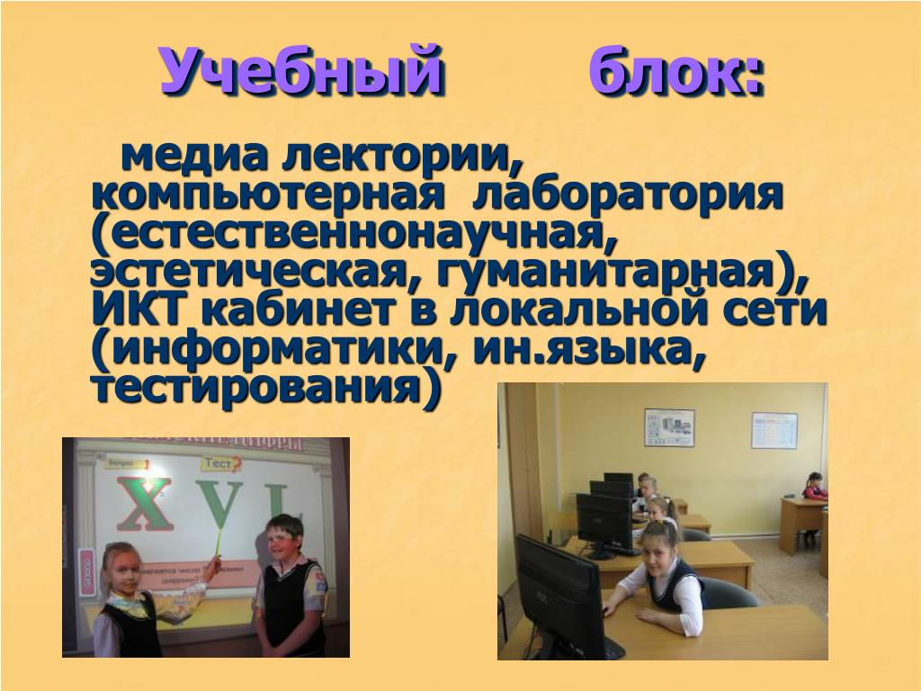 Учебный блок: медиа лектории, компьютерная лаборатория (естественнонаучная, эстетическая, гуманитарная), ИКТ кабинет в локальной сети (информатики, ин.языка, тестирования)