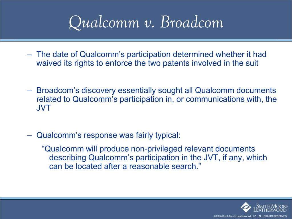 Qualcomm v. Broadcom • The date of Qualcomm’s participation determined whether it had waived its rights to enforce the two patents involved in the suit • Broadcom’s discovery essentially sought all Qualcomm documents related to Qualcomm’s participation in, or communications with, the JVT • Qualcomm’s response was fairly typical: “Qualcomm will produce non-privileged relevant documents describing Qualcomm’s participation in the JVT, if any, which can be located after a reasonable search.”