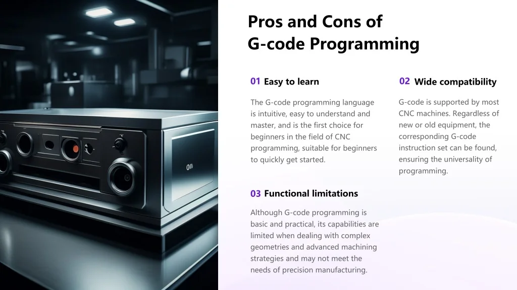 Pros and Cons of G-code Programming 02 Wide compatibility 01 Easy to learn G-code is supported by most CNC machines. Regardless of new or old equipment, the corresponding G-code instruction set can be found, ensuring the universality of programming. The G-code programming language is intuitive, easy to understand and master, and is the first choice for beginners in the field of CNC programming, suitable for beginners to quickly get started. 03 Functional limitations Although G-code programming is basic and practical, its capabilities are limited when dealing with complex geometries and advanced machining strategies and may not meet the needs of precision manufacturing.