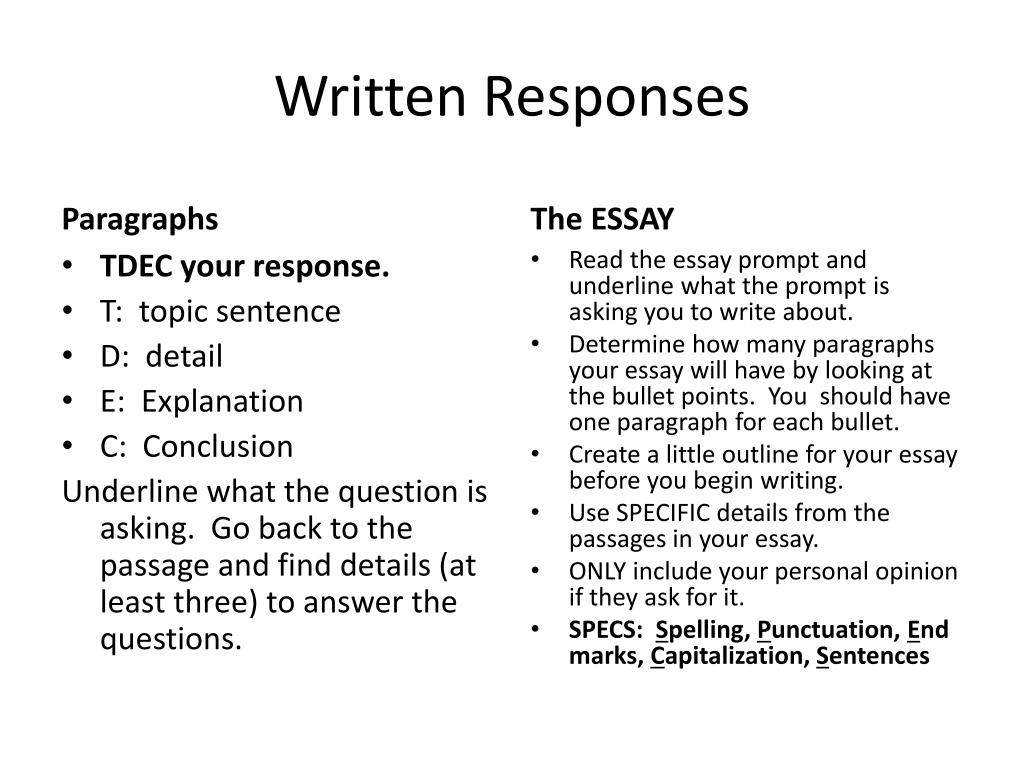 Written Responses Paragraphs The ESSAY Read the essay prompt and underline what the prompt is asking you to write about. Determine how many paragraphs your essay will have by looking at the bullet points. You should have one paragraph for each bullet. Create a little outline for your essay before you begin writing. Use SPECIFIC details from the passages in your essay. ONLY include your personal opinion if they ask for it. SPECS: Spelling, Punctuation, End marks, Capitalization, Sentences • TDEC your response. • T: topic sentence • D: detail • E: Explanation • C: Conclusion Underline what the question is asking. Go back to the passage and find details (at least three) to answer the questions.
