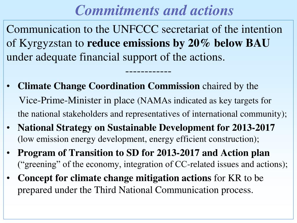 Commitments and actions Communication to the UNFCCC secretariat of the intention of Kyrgyzstan to reduce emissions by 20% below BAU under adequate financial support of the actions. ------------ • Climate Change Coordination Commission chaired by the Vice-Prime-Minister in place (NAMAs indicated as key targets for the national stakeholders and representatives of international community); • National Strategy on Sustainable Development for 2013-2017 (low emission energy development, energy efficient construction); • Program of Transition to SD for 2013-2017 and Action plan (“greening” of the economy, integration of CC-related issues and actions); • Concept for climate change mitigation actions for KR to be prepared under the Third National Communication process.