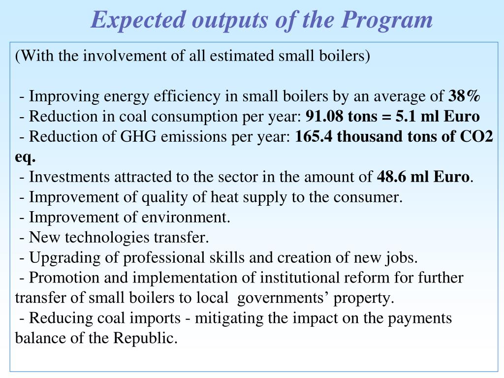 Expected outputs of the Program (With the involvement of all estimated small boilers) - Improving energy efficiency in small boilers by an average of 38%- Reduction in coal consumption per year: 91.08 tons = 5.1 ml Euro-Reduction of GHG emissions per year: 165.4 thousand tons of CO2 eq.-Investments attracted to the sector in the amount of 48.6 ml Euro.-Improvement of quality of heat supply to the consumer.-Improvement of environment.-New technologies transfer.-Upgrading of professional skills and creation of new jobs.- Promotion and implementation of institutional reform for further transfer of small boilers to local governments’ property.-Reducing coal imports - mitigating the impact on the payments balance of the Republic.