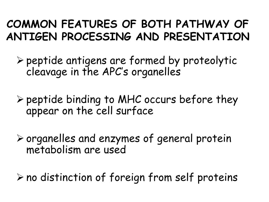 COMMON FEATURES OF BOTH PATHWAY OF ANTIGEN PROCESSING AND PRESENTATION • peptide antigens are formed by proteolytic cleavage in the APC’s organelles • peptide binding to MHC occurs before they appear on the cell surface • organelles and enzymes of general protein metabolism are used • no distinction of foreign from self proteins
