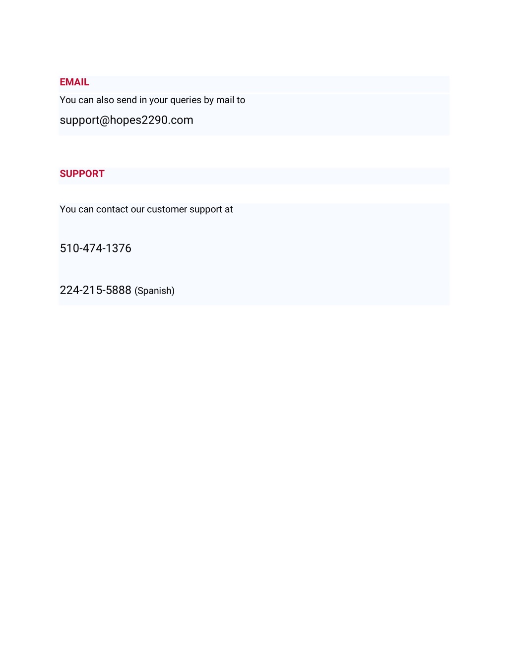 EMAIL You can also send in your queries by mail to support@hopes2290.com SUPPORT You can contact our customer support at 510-474-1376 224-215-5888 (Spanish)