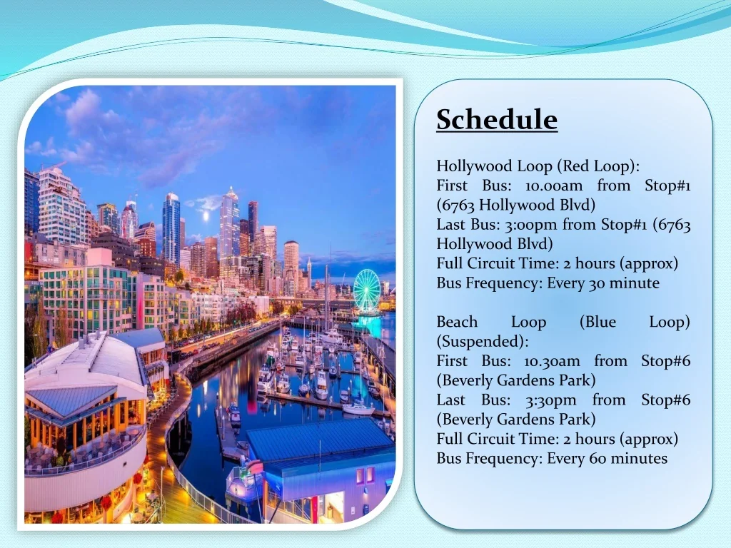 Schedule Hollywood Loop (Red Loop): First Bus: 10.00am from Stop#1 (6763 Hollywood Blvd) Last Bus: 3:00pm from Stop#1 (6763 Hollywood Blvd) Full Circuit Time: 2 hours (approx) Bus Frequency: Every 30 minute Beach Loop (Blue Loop) (Suspended): First Bus: 10.30am from Stop#6 (Beverly Gardens Park) Last Bus: 3:30pm from Stop#6 (Beverly Gardens Park) Full Circuit Time: 2 hours (approx) Bus Frequency: Every 60 minutes