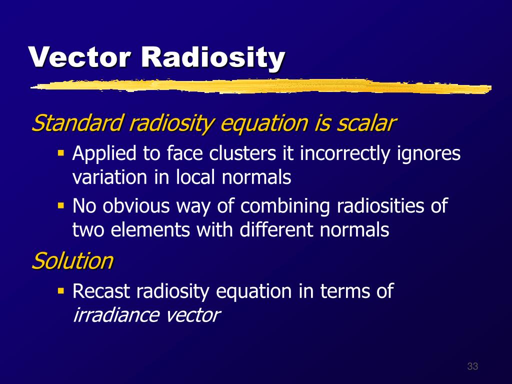 Vector Radiosity • Standard radiosity equation is scalar • Applied to face clusters it incorrectly ignores variation in local normals • No obvious way of combining radiosities of two elements with different normals • Solution • Recast radiosity equation in terms of irradiance vector