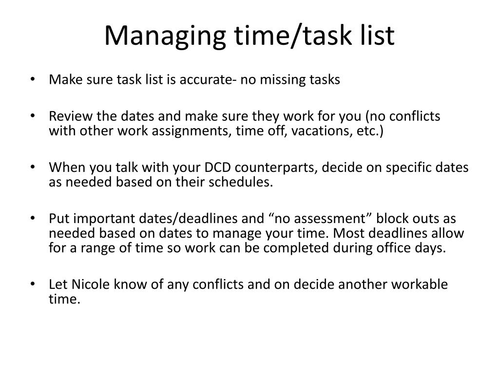 Managing time/task list • Make sure task list is accurate- no missing tasks • Review the dates and make sure they work for you (no conflicts with other work assignments, time off, vacations, etc.) • When you talk with your DCD counterparts, decide on specific dates as needed based on their schedules. • Put important dates/deadlines and “no assessment” block outs as needed based on dates to manage your time. Most deadlines allow for a range of time so work can be completed during office days. • Let Nicole know of any conflicts and on decide another workable time.