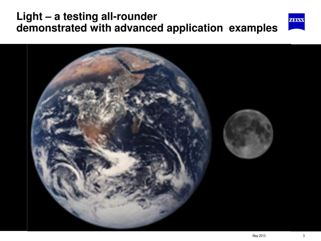 China International Optoelectronic Conference 2013 (CIOEC)China International Advanced Optical Manufacturing & Precision Engineering Forum 2013 Optical Testing Technology Session Light – a testing all-rounder demonstrated with advanced application examples Hexin Wang, China Innovation and R&D Center, Carl Zeiss Shanghai Shenzhen, 9/5/2013