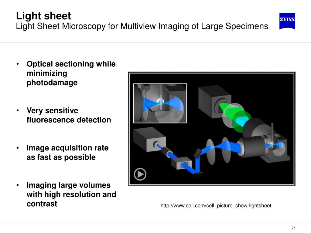 Light sheetLight Sheet Microscopyfor Multiview Imaging of Large Specimens • Optical sectioning while minimizing photodamage • Very sensitive fluorescence detection • Image acquisition rate as fast as possible • Imaging large volumes with high resolution and contrast http://www.cell.com/cell_picture_show-lightsheet