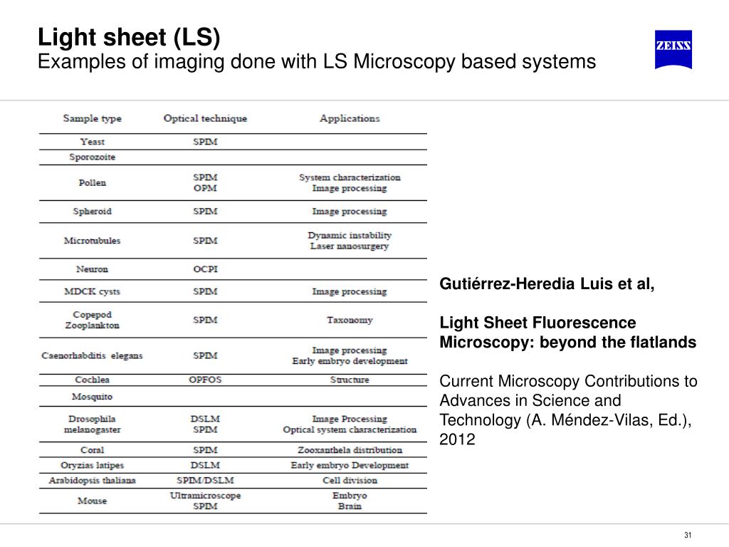 Light sheet (LS)Examples of imaging done with LS Microscopy based systems Gutiérrez-Heredia Luis et al, Light Sheet Fluorescence Microscopy: beyond the flatlands Current Microscopy Contributions to Advances in Science and Technology (A. Méndez-Vilas, Ed.), 2012