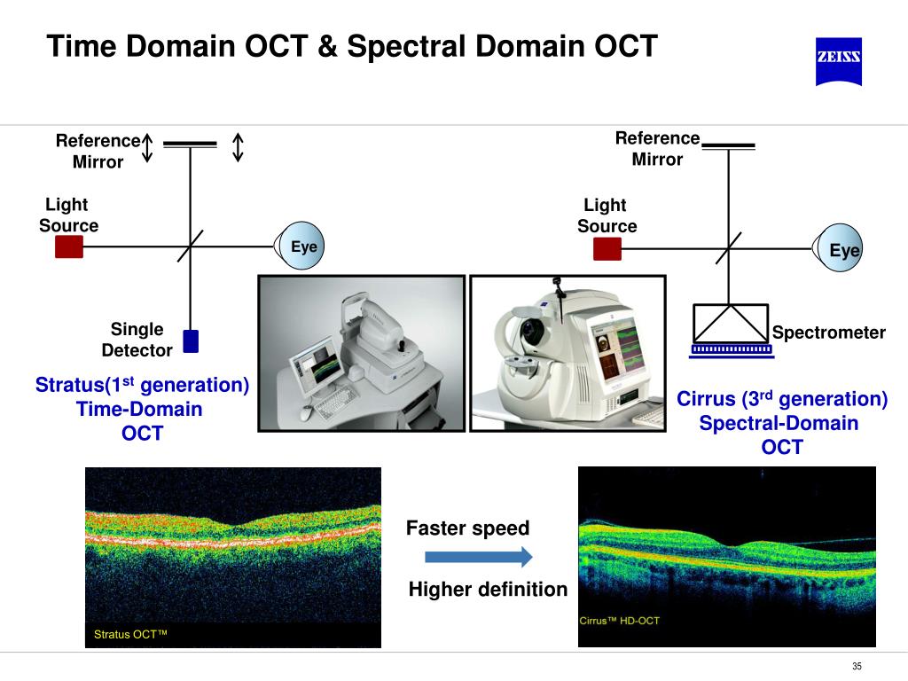 Stratus OCT™ Time Domain OCT & Spectral Domain OCT Reference Mirror Reference Mirror Light Source Light Source Eye Eye Spectrometer Single Detector Cirrus (3rd generation) Spectral-Domain OCT Stratus(1st generation) Time-Domain OCT Faster speed Higher definition