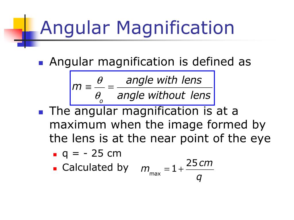 Angular Magnification • Angular magnification is defined as • The angular magnification is at a maximum when the image formed by the lens is at the near point of the eye • q = - 25 cm • Calculated by