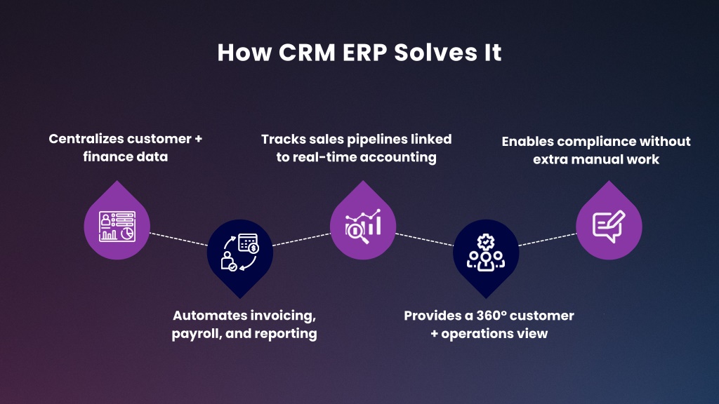 How CRM ERP Solves It Centralizes customer + finance data Tracks sales pipelines linked to real-time accounting Enables compliance without extra manual work Automates invoicing, payroll, and reporting Provides a 360° customer + operations view
