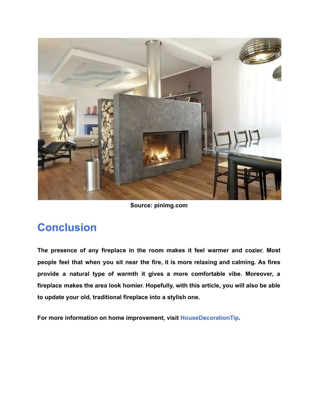 Source: pinimg.com Conclusion The presence of any fireplace in the room makes it feel warmer and cozier. Most people feel that when you sit near the fire, it is more relaxing and calming. As fires provide a natural type of warmth it gives a more comfortable vibe. Moreover, a fireplace makes the area look homier. Hopefully, with this article, you will also be able to update your old, traditional fireplace into a stylish one. For more information on home improvement, visit HouseDecorationTip.