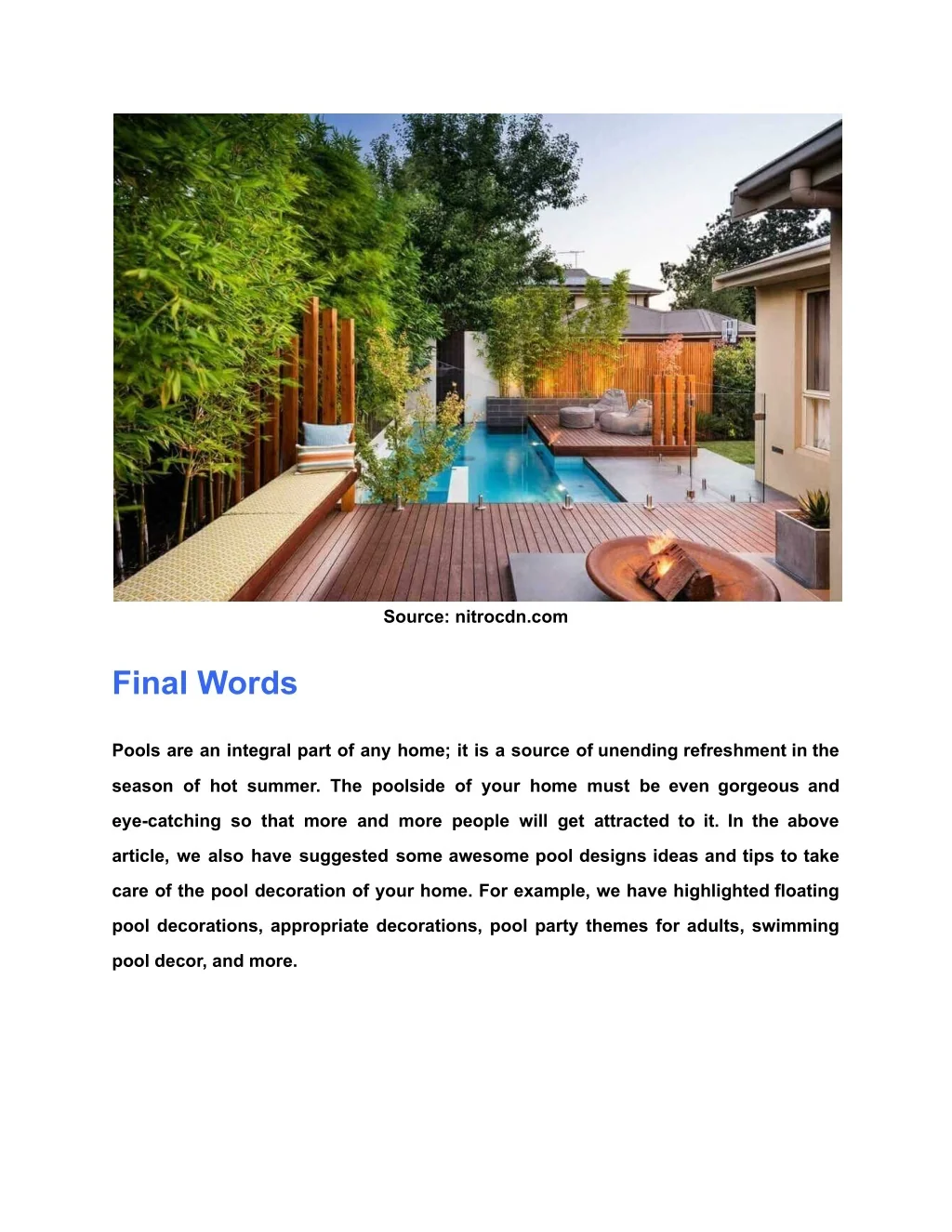 Source: nitrocdn.com Final Words Pools are an integral part of any home; it is a source of unending refreshment in the season of hot summer. The poolside of your home must be even gorgeous and eye-catching so that more and more people will get attracted to it. In the above article, we also have suggested some awesome pool designs ideas and tips to take care of the pool decoration of your home. For example, we have highlighted floating pool decorations, appropriate decorations, pool party themes for adults, swimming pool decor, and more.